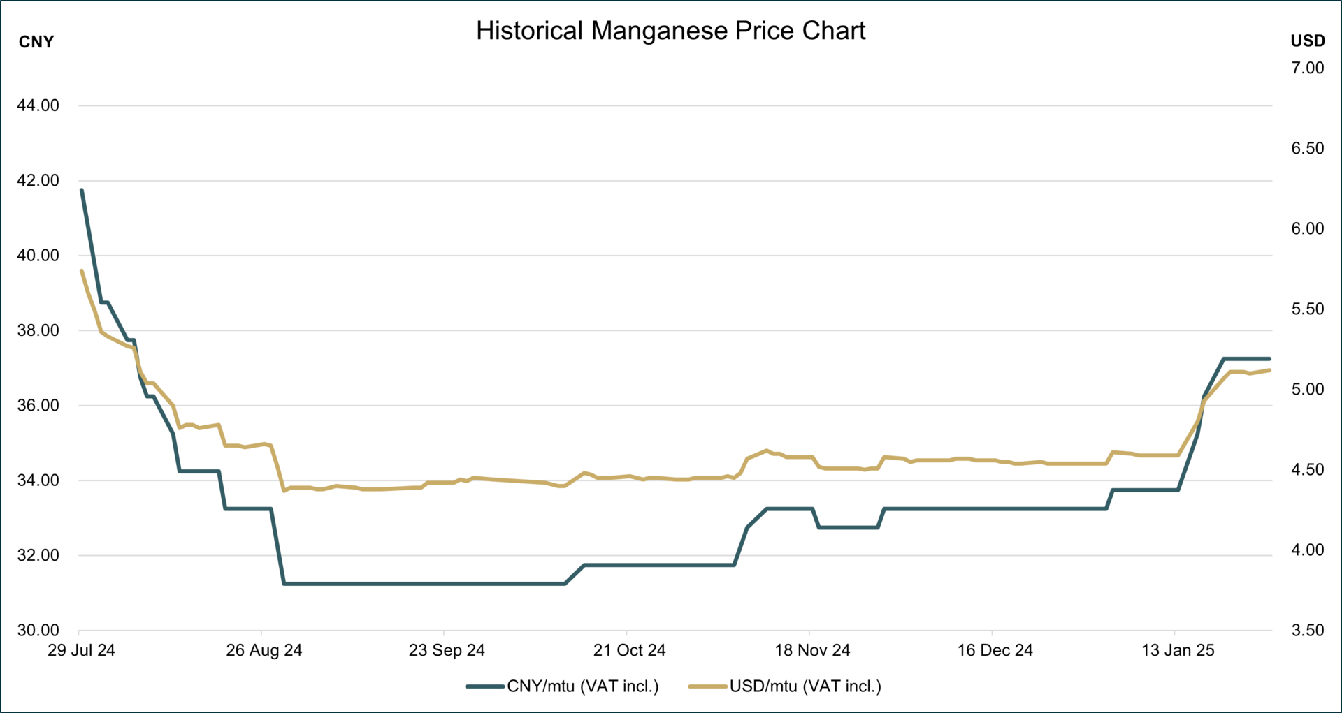 Disclaimer: The above price as published by Shanghai Metals Market reflects the traded price for manganese ore with a manganese content between 36-37% in Northern China. The majority of manganese ore imported into China is through Tianjin port. This price is therefore indicative of transaction prices achieved by traders who have material at Tianjin port. On the basis, it is a domestic sales price quoted in Chinese Yuan (“CNY”) it includes value added tax ("VAT") at 13%.